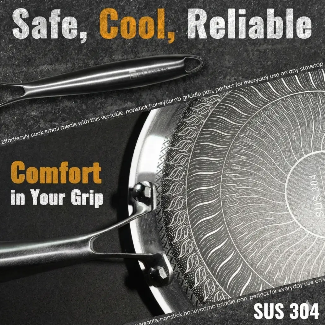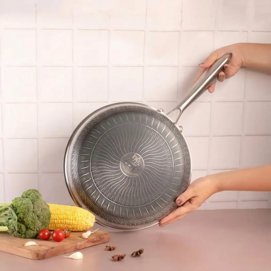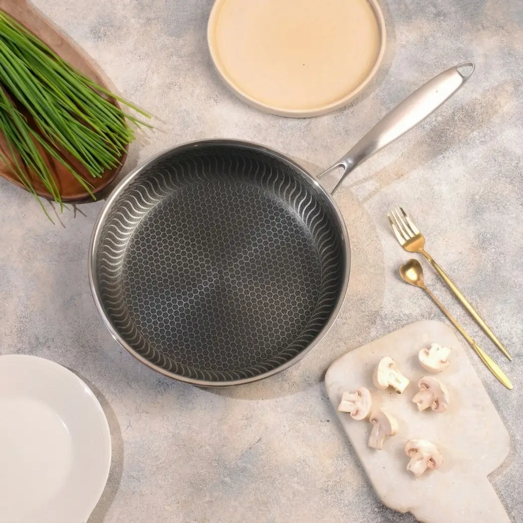 Upgrade your kitchen with the Double-Sided Honeycomb Tri-Ply Stainless Steel Fry Pan, crafted for long-lasting performance, superb heat control, and healthier cooking. Featuring a full-body tri-ply structure, this fry pan layers stainless steel + aluminum core + stainless steel, ensuring rapid heat conduction and perfectly even cooking — no hotspots, no burning.