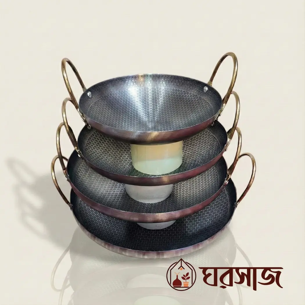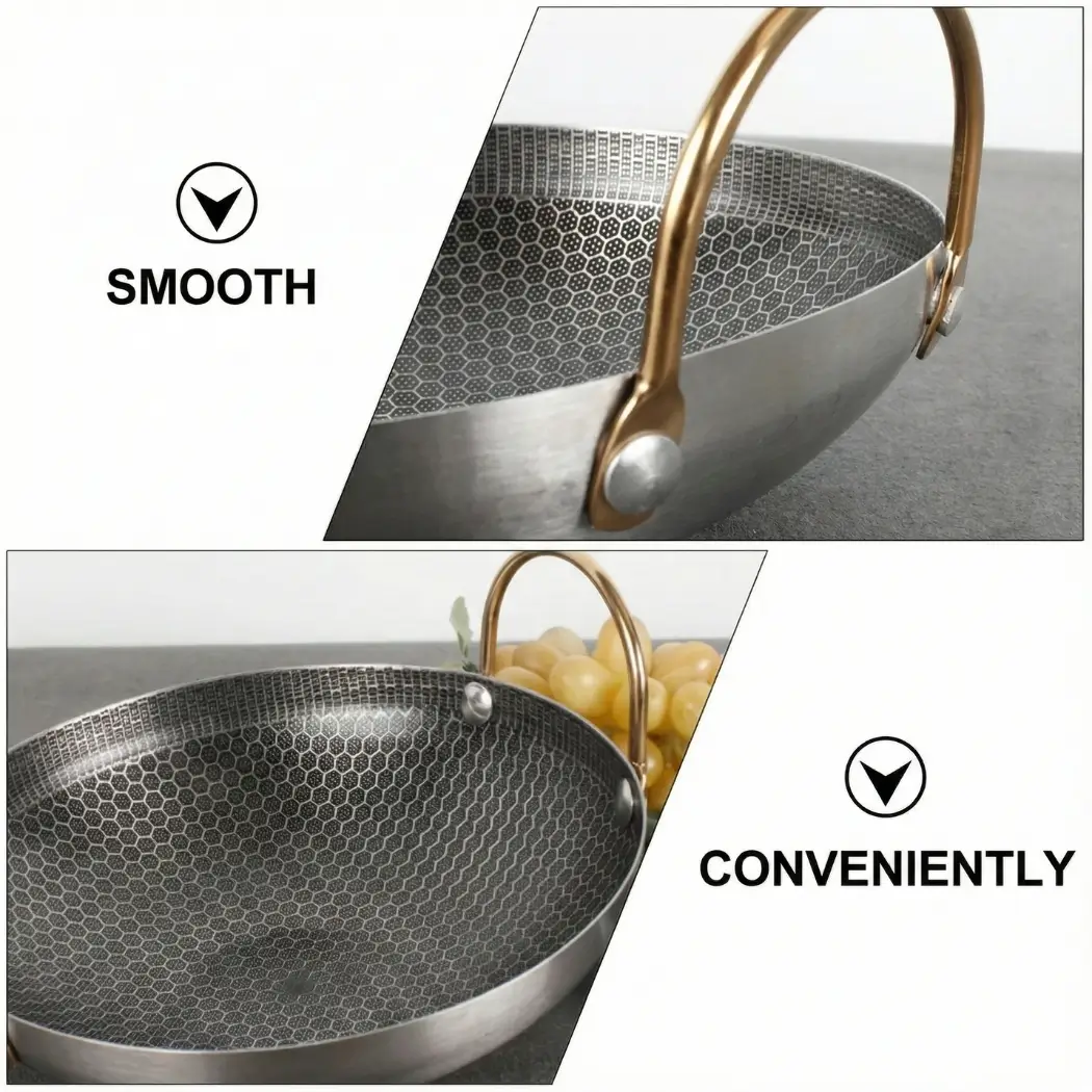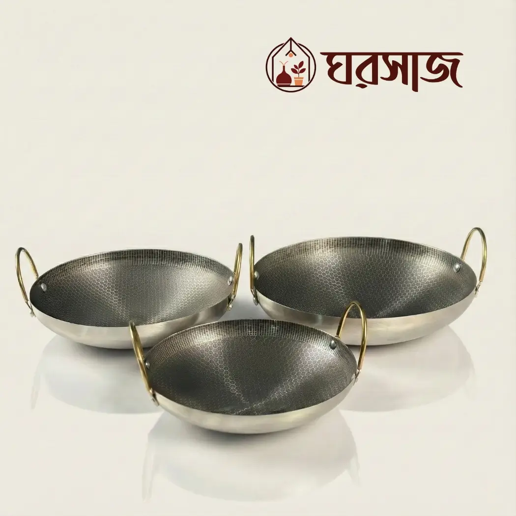 Cook like a pro with this Premium Double-Side Honeycomb 316 Stainless Steel Wok (Korai) — engineered for Bangladeshi kitchens that demand durability, fast heating, and easy cleanup. The double-side honeycomb texture protects the non-stick layer from scratches while allowing high-heat searing and quick stir-frying. Made with food-grade 316 stainless steel, this wok offers superior corrosion resistance and long-term durability compared with ordinary stainless grades — ideal for everyday use and coastal/humid environments. The induction-ready stainless base promotes even heat distribution and faster cooking with lower gas or electricity use. Two sturdy handles give secure, traditional korai handling for tossing and serving.