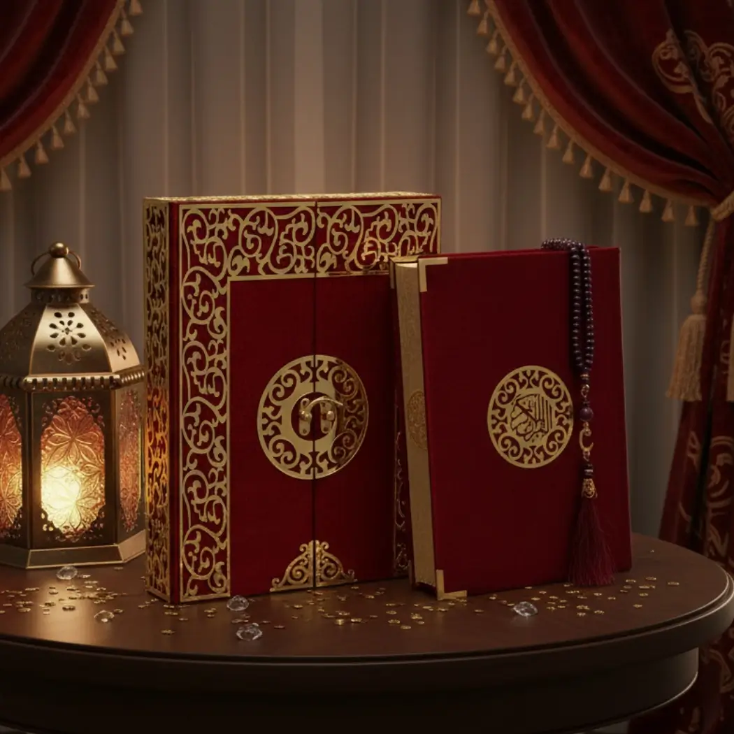 The rich red color symbolizes honor and warmth, making this set a standout piece for display or gifting. Perfect for weddings, anniversaries, Ramadan, Eid, aqiqah, and housewarming occasions, it is a timeless Islamic gift that carries both spiritual value and aesthetic grace.