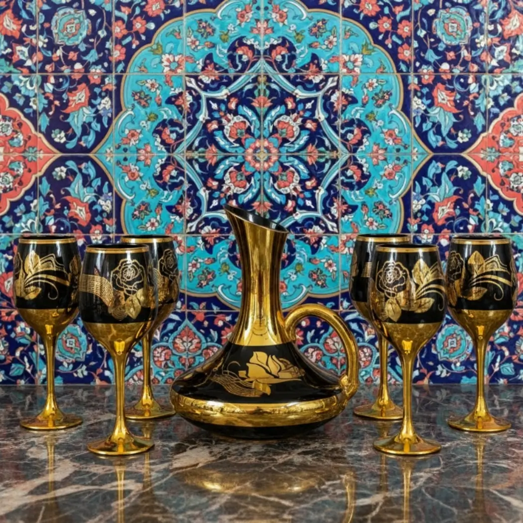 Turkish Designed 7 Piece Jug & Glass Set – Black Flower