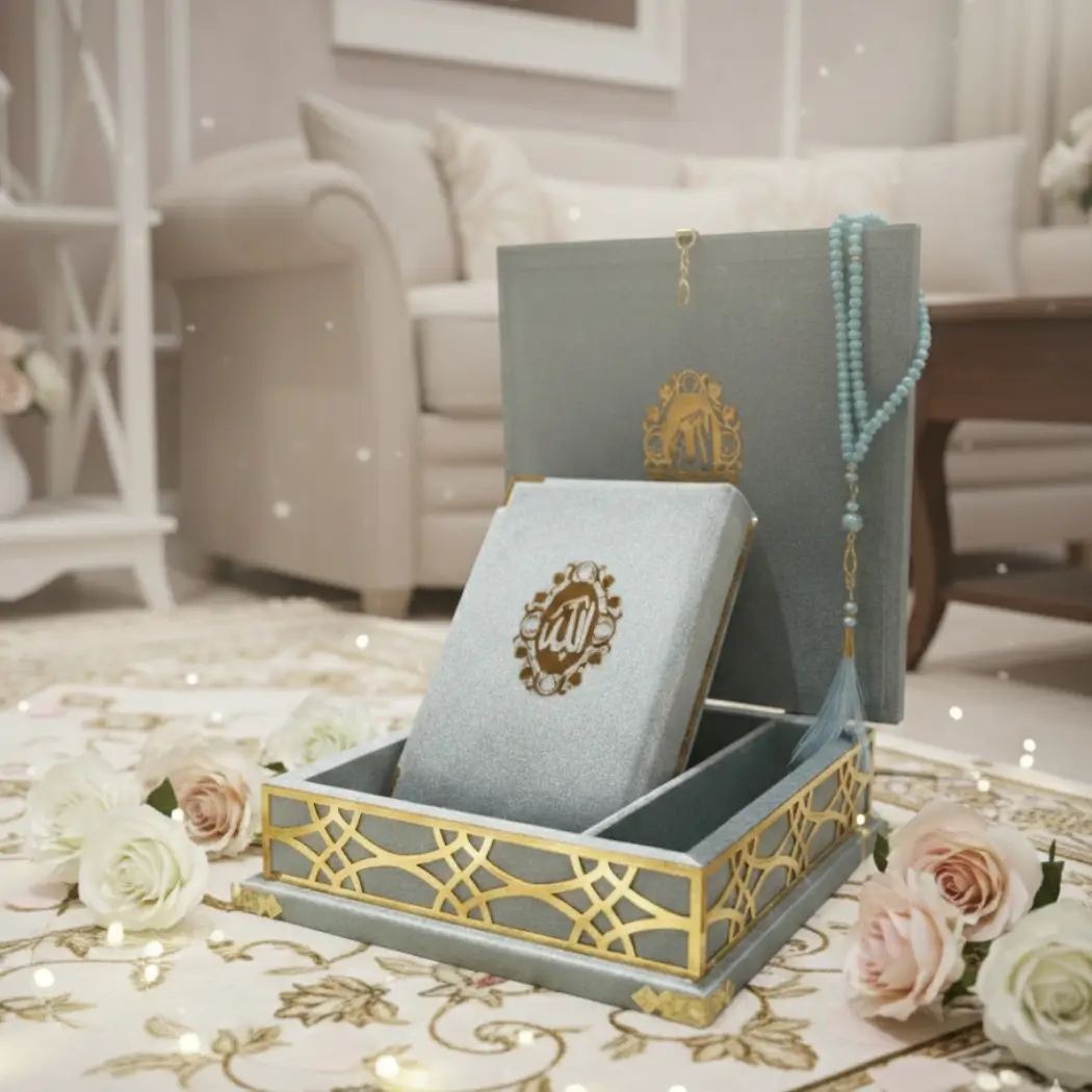 The Turquoise Velvet Quran Gift Set is designed with beauty and spiritual grace. The velvet-covered Quran and matching 6mm Tasbih are placed in a premium turquoise velvet gift box, crafted with fine details in Turkey. The refreshing turquoise color reflects purity, peace, and new beginnings—making it a meaningful present for all occasions.